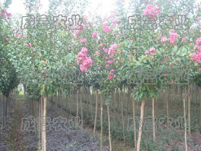 紫薇:屬落葉灌木或小喬木。在江蘇紫薇基地人工培育,數(shù)量大。紫薇為小喬木,有時呈灌木狀,高3~7米;樹皮易脫落,樹干光滑。幼枝略呈四棱形,稍成翅狀。葉互生或?qū)ι,近無柄;橢圓形、倒卵形或長橢圓形,長3~7厘米,寬2.5~4厘米,光滑無毛或沿主脈上有毛。圓錐花序頂生,長4~20厘米;花徑2.5~3厘米;花萼6淺裂,裂片卵形,外面平滑;花瓣6,紅色或粉紅色,邊緣有不規(guī)則缺刻,基部有長爪;雄蕊36~42,外側(cè)6枚花絲較長;子房6室。蒴果橢圓狀球形,長9~13毫米,寬8~11毫米,6瓣裂。種子有翅;ㄆ6~9月,果期7~9月。 樹干愈老愈光華,用手撫摸,全株微微顫動,故又稱為入驚兒樹、癢癢樹。 同時也是山西晉城市市花。